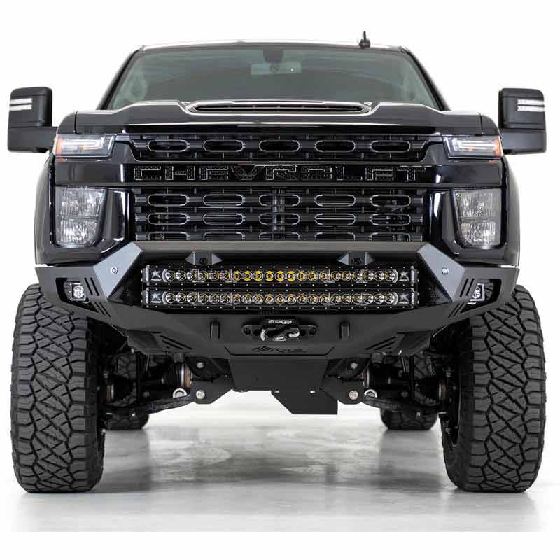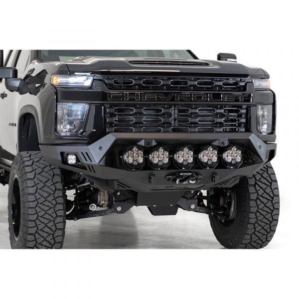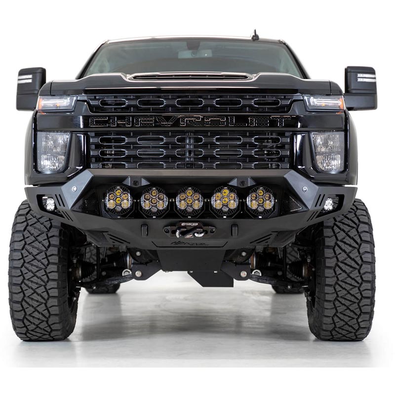 The ADD Offroad F270043500103 Bomber HD Front Bumper will give the front of your Chevy Silverado 2500HD/3500HD an aggressive look. A heavy-duty truck demands a heavy-duty bumper and this bumper features a rugged plate steel design. For unparalleled strength, this bumper has a separate plate connects your winch directly to the frame. This bumper offers even greater versatility with the strengthened clevis mounts that can be used to install 3/4" D-Rings. One cube light can also be mounted behind each side panel and this bumper retains the OEM parking sensors. Multiple light mounting options are available, including dual 40" radius light bars, six Rigid 360 series lights, or five Baja Designs LP6 lights.
