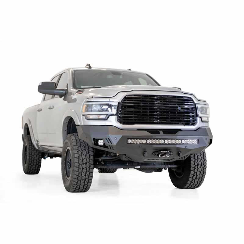 Take your 2019-2023 Ram 2500/3500 to the next level when you install the ADD Offroad F561423030103 Stealth Fighter Front Bumper from Spooled Up Performance. Addictive Desert Designs takes great pride in introducing the Stealth Fighter line of bumpers for the 2020-2023 Ram 2500/3500 platform. The bumper boasts a radius plate steel design that enables it to remain tight to the front of the truck. In the center of the bumper is a universal light mount system that allows for the use of a 40" radius light bar or up to 10 cube lights. Furthermore, there is an extra cube light mount located behind each side panel. This bumper retains the OEM parking sensors thanks to the standard cutouts.