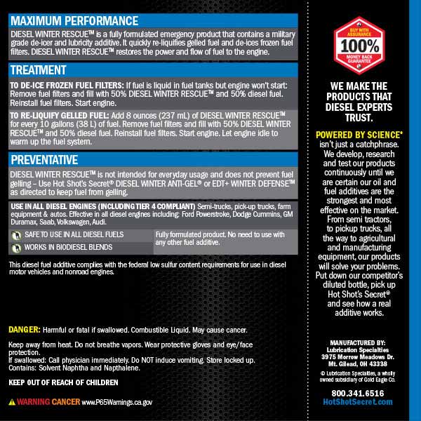 The Diesel Winter Rescue Emergency Fuel Additive - 32 Oz. is an emergency de-icer for your vehicle. The Winter Rescue is military grade and quickly re-liquifies gelled fuel and de-ices frozen fuel filters. This additive de-gels fuel in the tank, fuel lines, and pumps.