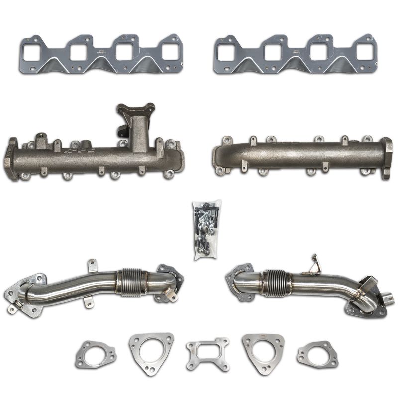The PPE 116112500 High-Flow Exhaust Manifolds With Up-Pipes Kit are high-flowing replacement manifolds for your 2017-2024 GM 6.6L Duramax L5P. These manifolds are manufactures from a high-sil moly casting for strength and durability. The aircraft-grade 304 stainless steel up-pipes feature bellows that are internally sleeved and made with an increased inner diameter for better flow. This manifold & up-pipe kit is engineered to optimize horsepower and flow characteristics, lower exhaust gas temperatures (EGTs) while enhancing turbo spool-up, fuel economy, and reliability.