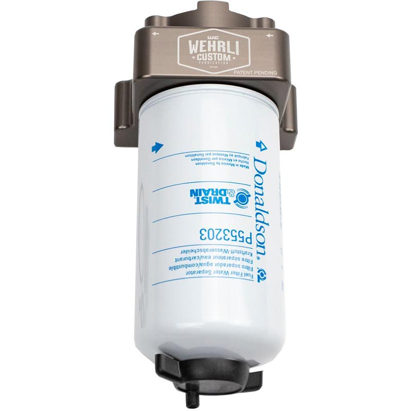 Upgrade your stock fuel filter with the Wehrli Custom Fab WCF100361 Duramax Fuel Filter Housing (Long Bed) from Spooled Up Performance. Featuring an anodized billet aluminum fuel filter base, this upgrade kit installs in the same location as the stock cartridge filter base using the same OEM style quick disconnect fuel line fittings. This kit includes a Donaldson 4 micron fuel filter and water separator, filter base with integral mounting, distribution filter block/filter coupler, quick disconnect fittings, and 1/8" NPT port for fuel pressure monitoring. Increase fuel filter capacity and amount of time between filter changes by upgrading from a stock cartridge style filter to a spin-on canister style filter.